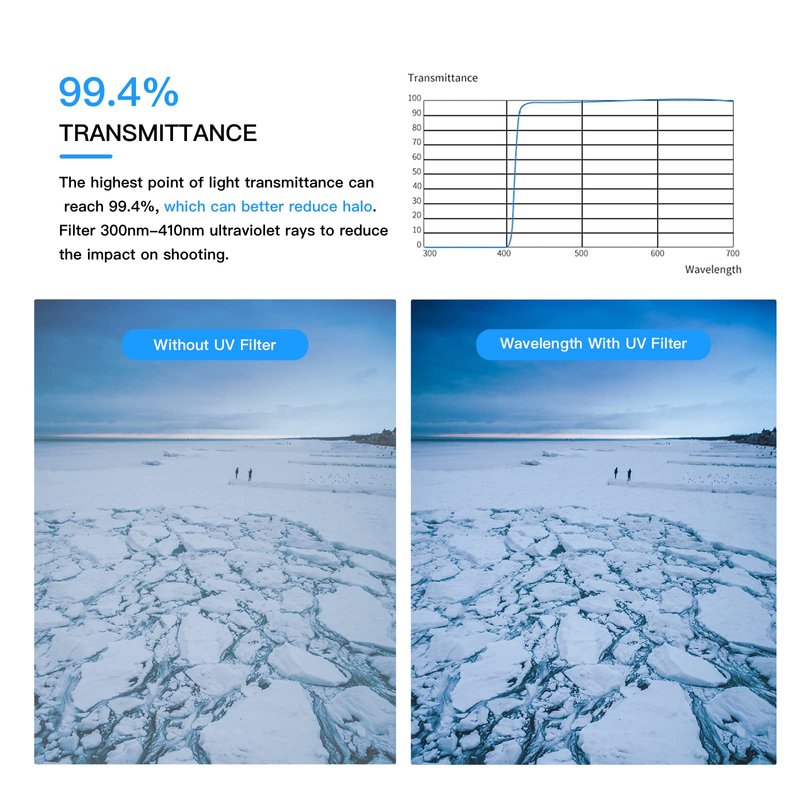 - 【High-Quality Optical Glass】The quality optical glass protects your lens from dirt, scratches, fingerprints, and unexpected damage,Nano-Coatings Featuring 16 layers of optical coatings and a light transmittance of up to 99.4% (and a minimum light reflectance of less than 0.3%), the multicoated UV filter blocks out ultraviolet rays ranging from 300nm to 410nm to reduce flare and ghosting while ensuring accurate color rendition