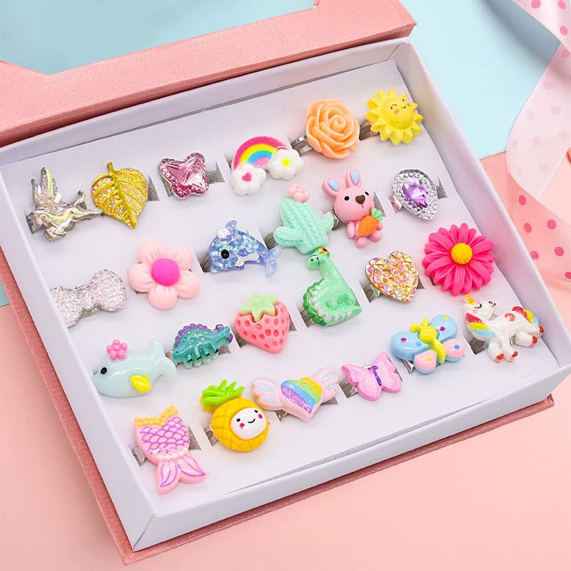 - 【Pretend Play Rings】: Package comes 24pcs little girl adjustable rings in a heart shape box, the rings with different style with Sunflower, unicorn, rabbit, rainbow, butterfly, fruits etc. The size can be adjustable. Usage of vibrant colors and lovely designs. Enough quantity for your beloved princess daily dress up. no duplication, shown as picture.