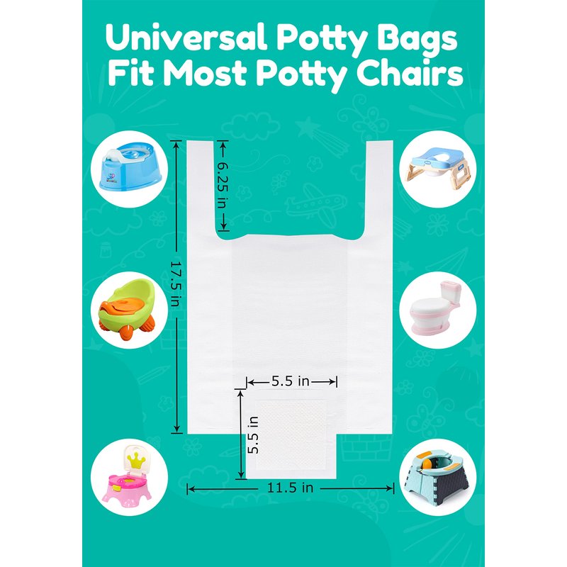 - UNIVERSAL FIT & PORTABLE POTTY BAGS - Compact and lightweight disposable potty refill bags can be carried anywhere, like putting in bags, cars, and homes. Generously sized potty training bags are suitable for most popular potty chairs like OXO 2-in-1 go potty. Even great for pet poop too!