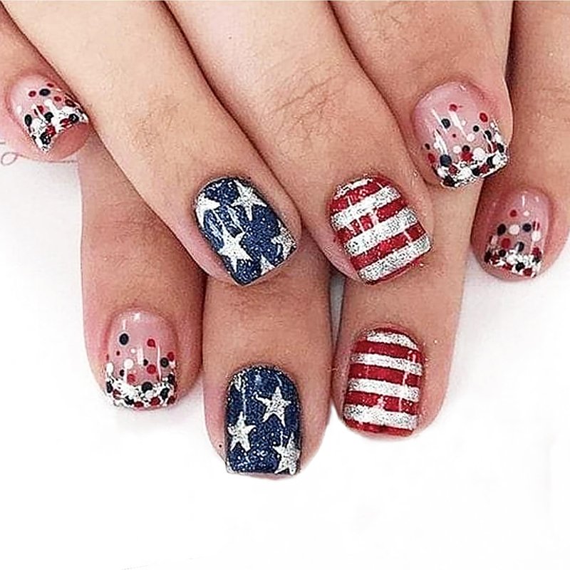 - 💅🏻 4th of July Nails Art Design- Patriotic 4th of July fake nails with stars designs, full of patriotic elements, will make your fingers more unique and shiny, express your nail charm. Making your Independence Day holiday more interesting.