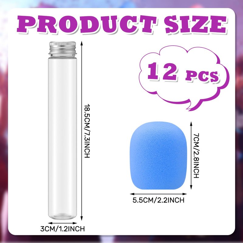 Features: Make a statement with our attractively colored mic covers for microphones, available in purple, pink, and blue. Not only designed for functionality, but our microphone covers also boast a vibrant, trendy look that is sure to appeal. Their distinct design can add a touch of appealing aesthetic to many occasions. Indulge in the versatility of our product. With neatly designed test tube and attractive mic sponge cover, our set can elevate different events, from scientific experiments to musical themed parties. Bright colors of the covers make them a fun choice for parties, while the practical uses of test tubes make them handy in labs. Specifications: Material: sponge, PET Microphone cover color: purple, pink, blue Size: Test tube: about 1.18 x 7.28 inches/ 3 x 18.5 cm Capacity: about 3.9 oz/ 115 ml Package includes: 12 x Plastic test tubes 12 x Microphone cover Notes: Manual measurement, please allow slight errors on size. The color may exist a slight difference due to different screen displays.