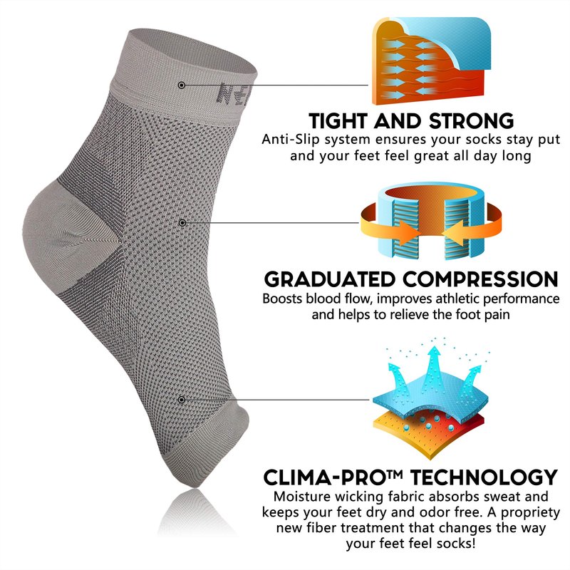 - CLIMA-PRO TECHNOLOGY – Our ankle sleeves provide superior relief of plantar fasciitis, heel spurs, ankle/arch support, and foot pain. They can help to reduce blood pooling and banish discomfort, as well as help with Achilles tendonitis, edema relief, and heel pain. Our compression socks can be worn after a rigorous activity to help your feet recover and to reduce swelling and soreness in the foot, ankle, and lower leg.