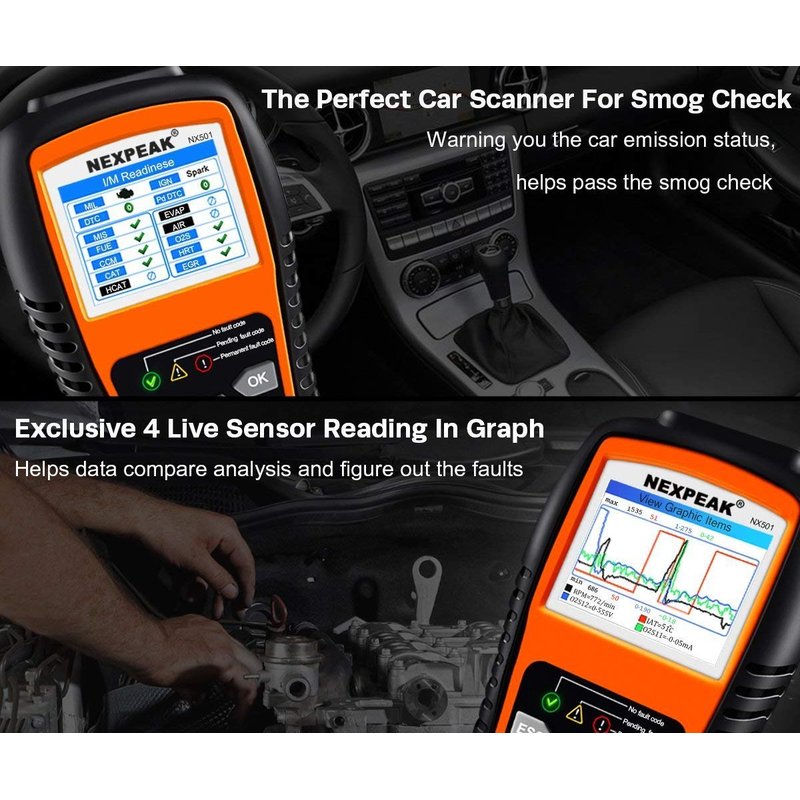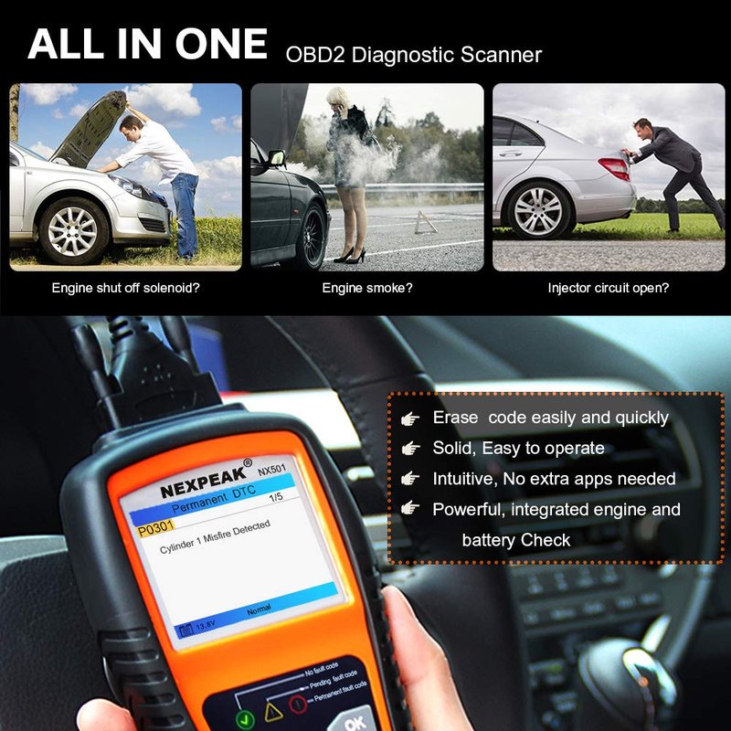 - 【Professional Car Code Reader】 NEXPEAK NX501 obd2 scanner is an enhanced auto scanner that you can not only check all engine related fault codes, find out what caused the check engine light comes on, turn-off Malfunction Indicator Lamp (MIL), locate bad O2 sensor, but also can monitor car battery health status, remind you when the battery need to be replaced. It’s a perfect scan tool helps you to determine if your car need to be repaired and avoid blind maintenance, saves your time and money.