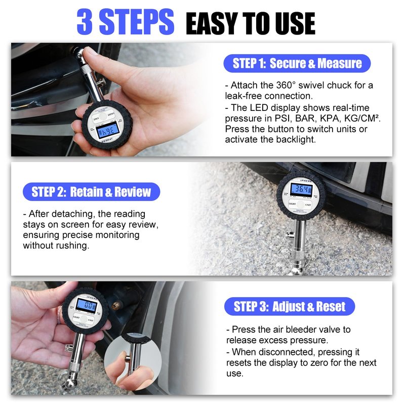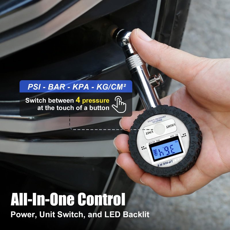 - 【FLEXIBILITY AND CONVENIENCE】 Use a single button to power on/off, switch pressure units (PSI–BAR–KPA–KG/CM²), and activate the LED backlight. A separate built-in bleeder valve allows for precise deflation, helping you fine-tune tire pressure for better traction, fuel efficiency, and driving safety