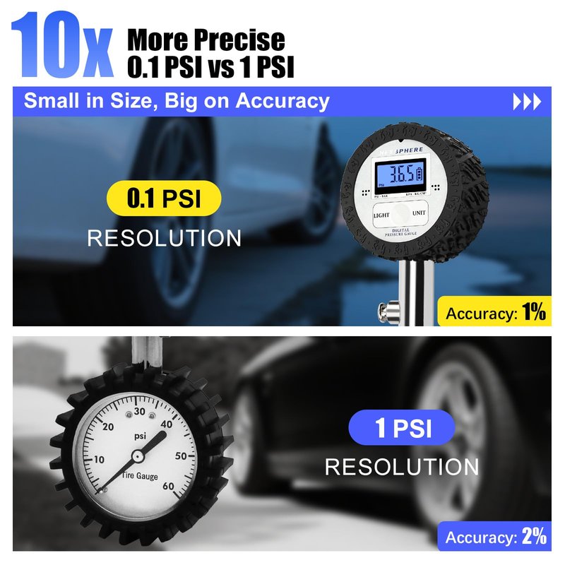 - 【50X MORE PRECISE + 0.1 PSI Resolution】 Get 50X more precision than analog gauges (0.1 PSI vs 5 PSI). The portable tire pressure gauge delivers accurate readings with ±1% precision and 0.1 PSI resolution. Designed for Cars, motorcycles, trucks, RVs, and high-demand use cases
