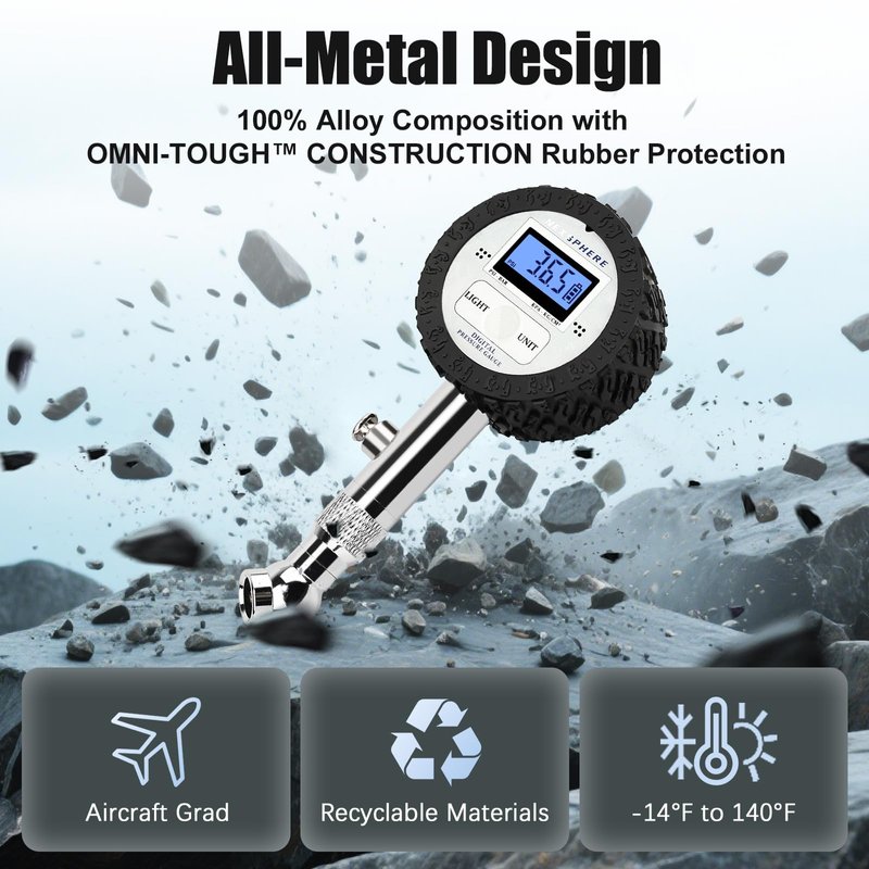 - 【ALL-METAL CONSTRUCTION FOR EXTREME DURABILITY】 Crafted from aircraft-grade alloys with a reinforced brass core, this tire gauge is wrapped in our signature OMNI-TOUGH rubber armor for enhanced shock absorption and grip. Drop-proof, crush-resistant, and weather-ready, it’s engineered to perform in harsh conditions from -14°F to 140°F