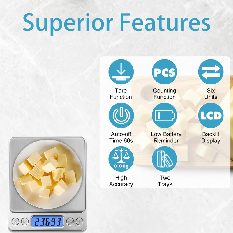 - 𝐇𝐢𝐠𝐡 𝐏𝐫𝐞𝐜𝐢𝐬𝐢𝐨𝐧 𝟎.𝟎𝟏𝐠 -- Equipped with high precision sensor can accurate 0.01g, and the weight range is from 0.04g to 500g, nine units makes it suitable use for weighing jewelry, medicine, flavor and cooking ingredients, improve work efficiency and convenient life.