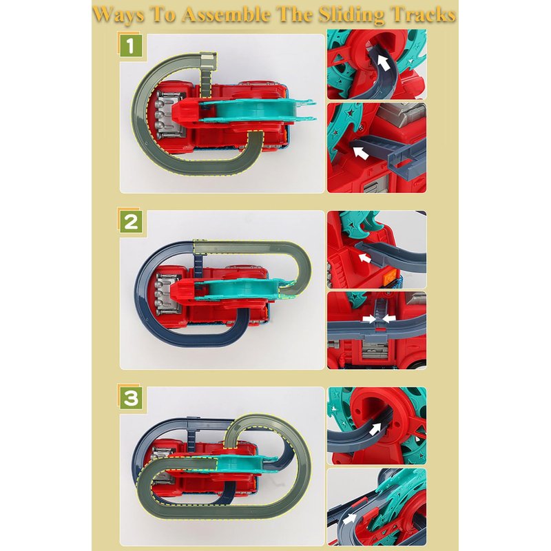 - 2 In 1 Fire Engine Slide Toy: The toy creatively combines the fire engine with the automatic slide toy. The fire engine can move on the ground with music and lights, and the little ducks can slide down the tracks after being sent to the top automatically.