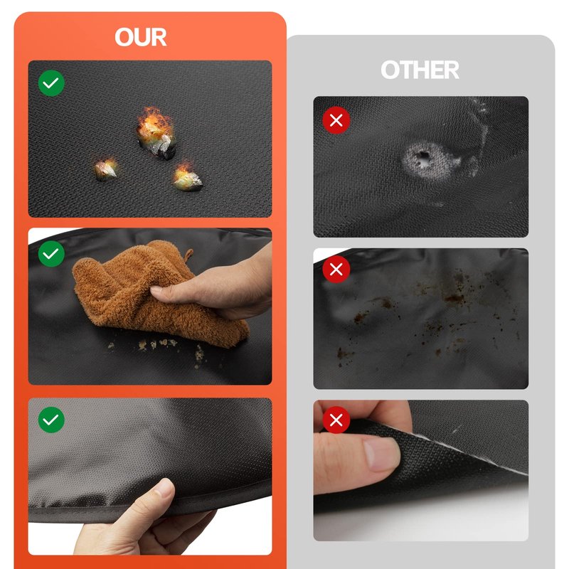 - 【Heat Resistant Fire Mat】The 36 inch fire pit mat is made of high-quality fiberglass, double layer organic silicone coating make it more heat resistant fireproof and flame-retardant. Fiberglass gives it an incredible heat resistance of up to 1800° F. Grill mats for outdoor grill deck protector your deck, grass, floor, lawn and patio