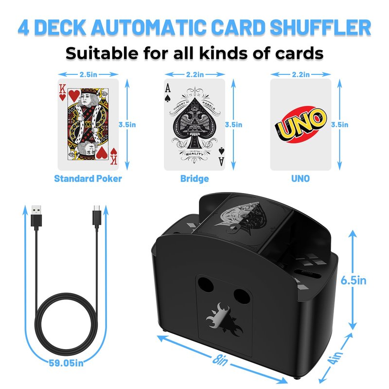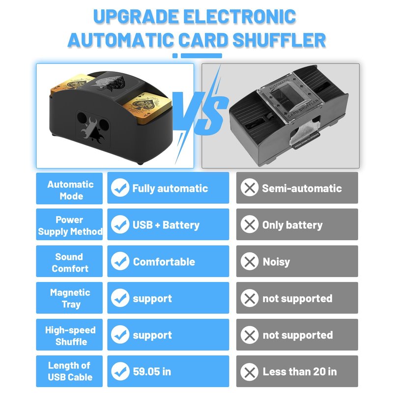 - New Upgrade Fully Automatic Cards Shuffler: The upgraded automatic card shuffler eliminates the need for continuous button pressing or manual shuffling, allowing for one-touch startup and quick shuffling, and automatic stop when shuffling is completed,providing convenience and efficiency. You can power it either through a USB cable (length 59.05in, unable to recharge) or with 4C batteries (not included).