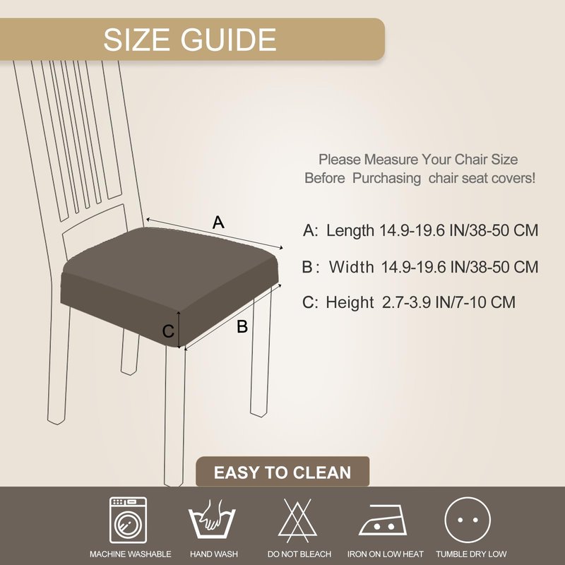 - 🪑 PERFECT FIT:Our stretchy seat covers are stretchable and fit most kitchen and dining room chairs, available in a variety of patterns, you can change the theme of the dining room with the chair covers and a table cloth for various events (brunches, dinners etc) to add elegance to the dining room. Please check the measuring guide in the product image to measure your chair before ordering, suitable seat cushion length: 14.9''-19.6'', width: 14.6''-19.6'', thickness: 2.7''-3.9''.