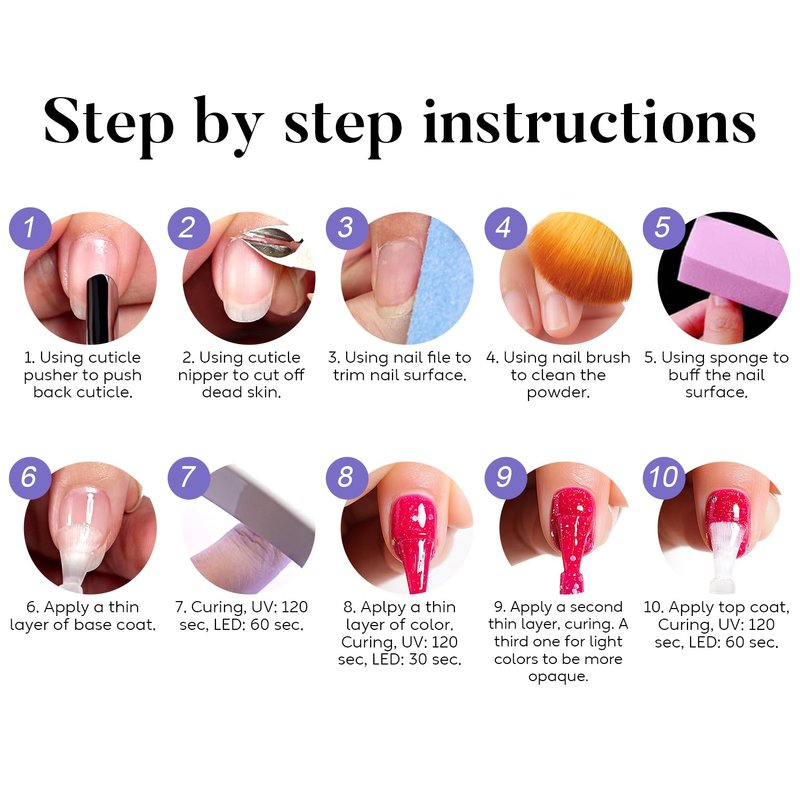 - Quick and Easy Application: : Get salon-grade nails in half the time with Nicedeco quick and easy application process. Simply brush on, and cure for 1-2 minutes with LED U V nail lamp.