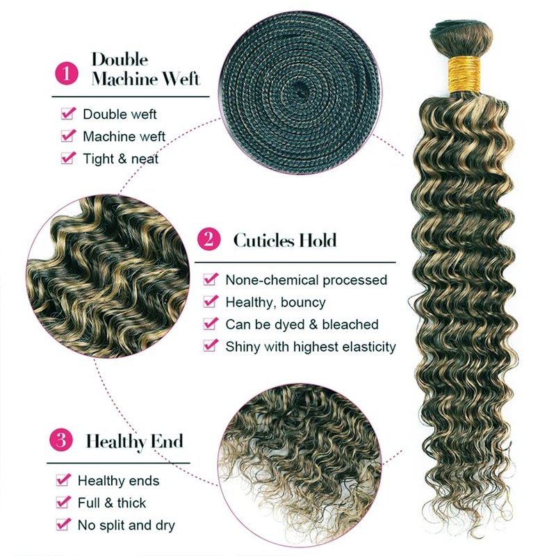 - 1.Human Hair Material:Unprocessed Brazilian Human Hair Bundles ,Brazilian P1B/27 Highlight Blonde Deep Wave Bundles ,No Tangles,No Shedding,No Chemical,Soft & Silky Clean & Neat.