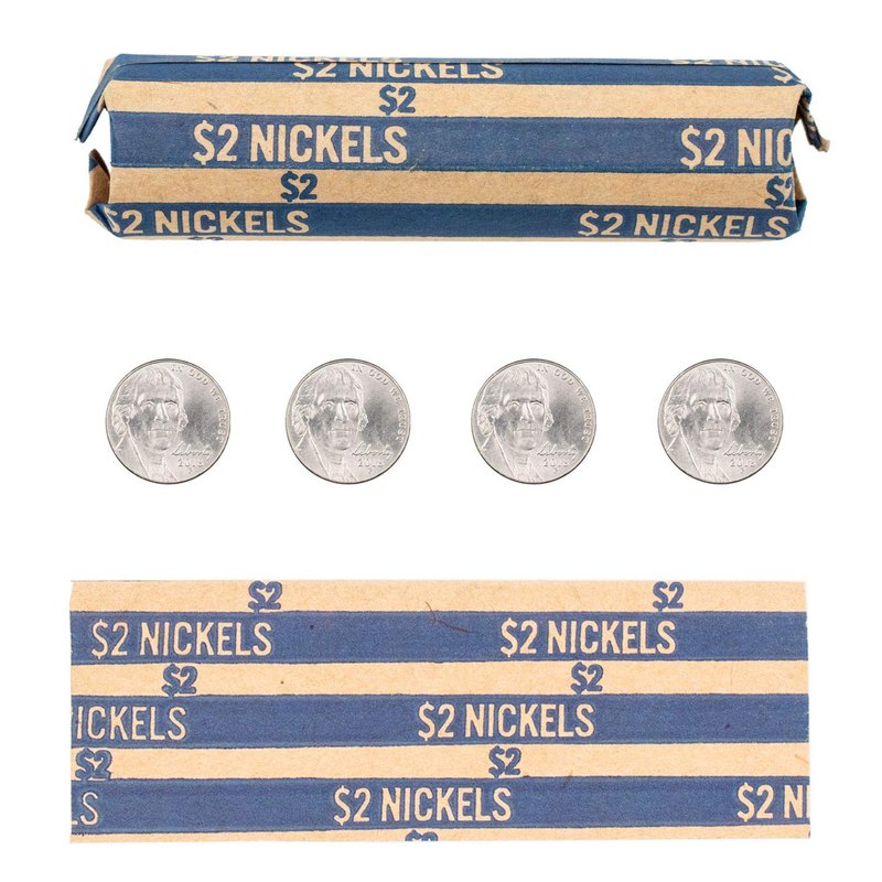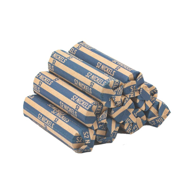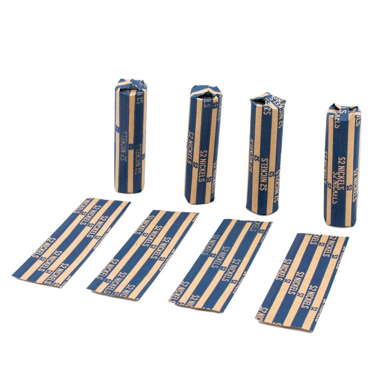 - Each wrapper is color-coded with a blue stripe containing the $2 nickel denomination and roll total for easy viewing and recognition