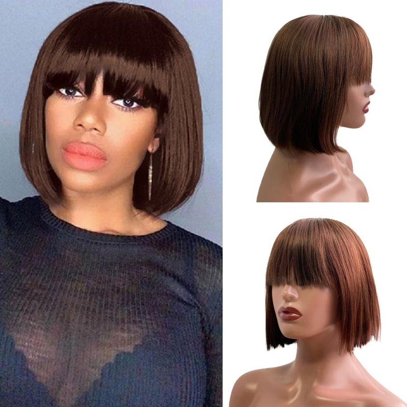 NICMISS Chocolate Brown Human Hair Wigs with Bangs Short Bob Wig Human Hair 10 Inch Straight Bob Wigs for Black Women Human Hair Glueless None Lace Front Brazilian Hair Dark Brown
