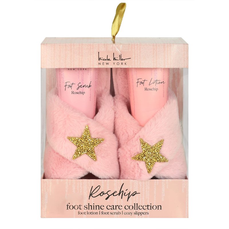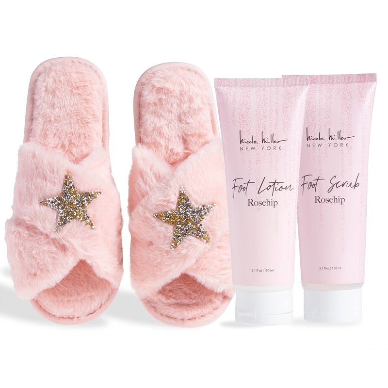 Nicole Miller Bath and Body Set with Slippers, Foot Scrub, and Lotion (Rosehip)