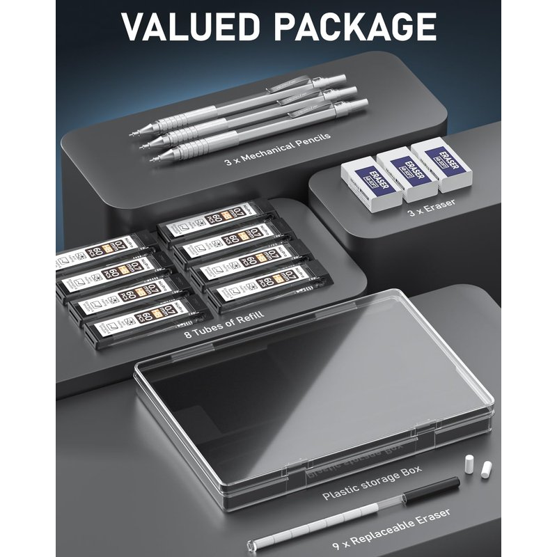 - Package contains: 3 pcs of 0.7 mm mechanical pencils with 8 tube of HB pencil lead, 3 pcs 4B-soft erasers, 9 pcs mini cap eraser refills in a storage case