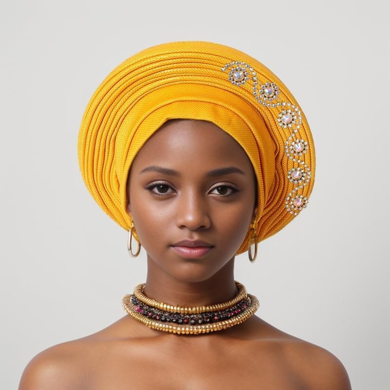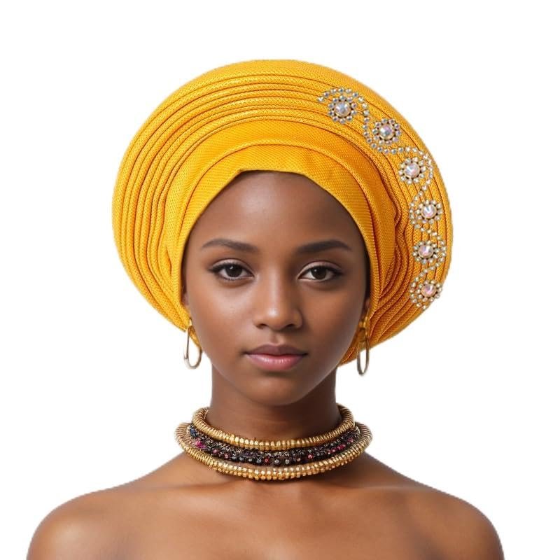 Nigerian Headtie with Stones Female Head Wraps Already Made Auto Gele Head Tie African Turban Cap for Party (Golden)