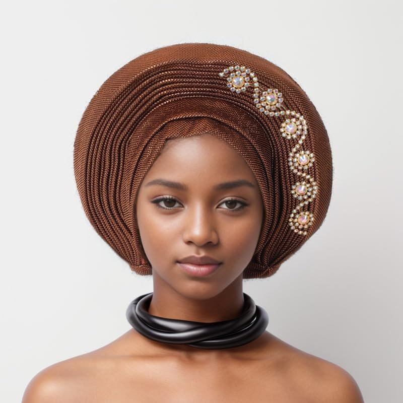 Pre Tied Stones African Headtie Turban Cap For Women Nigerian Aso Oke Headtie Auto Gele Head Wrap For Wedding Party Muslim Hats Fashion Headbands Bonnet Femme Headwear 1set-180g