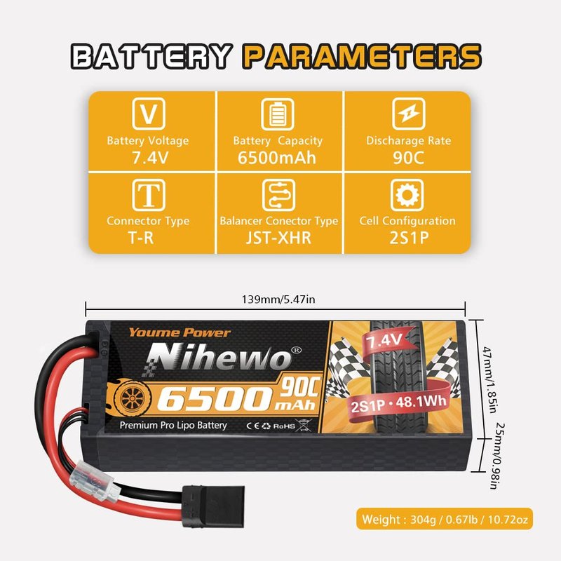 - 🔋RC Lipo Battery Parameter - Material: Lithium polymer, Battery Voltage: 7.4V, Cell Voltage:3.2V-4.2V, Cell Configuration: 2S1P, Capacity: 6500mAh, Discharge Rate: 50C, Charging plug: JST-XHR-3P, Discharging plug: Tr and EC5 connector, Pack: Hard case, Dimension(±3mm): 139*47*25mm / 5.47*1.85*0.98inch(L*W*H), Approx Weight(±15g): 304g / 0.67lb / 10.72oz