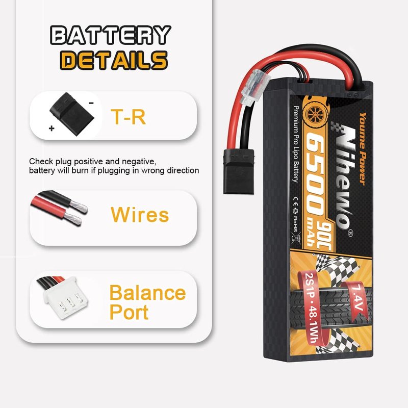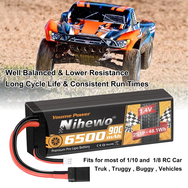 Nihewo 2Packs 2S Lipo Battery 7.4V 6500mAh RC Lipo Battery Pack 90C Hard Case with Tr Plug + EC5 Adapter Compatible with Arrma Axial 1/8 and 1/10 RC Truck Vehicles Car Truggy Buggy Racing Models
