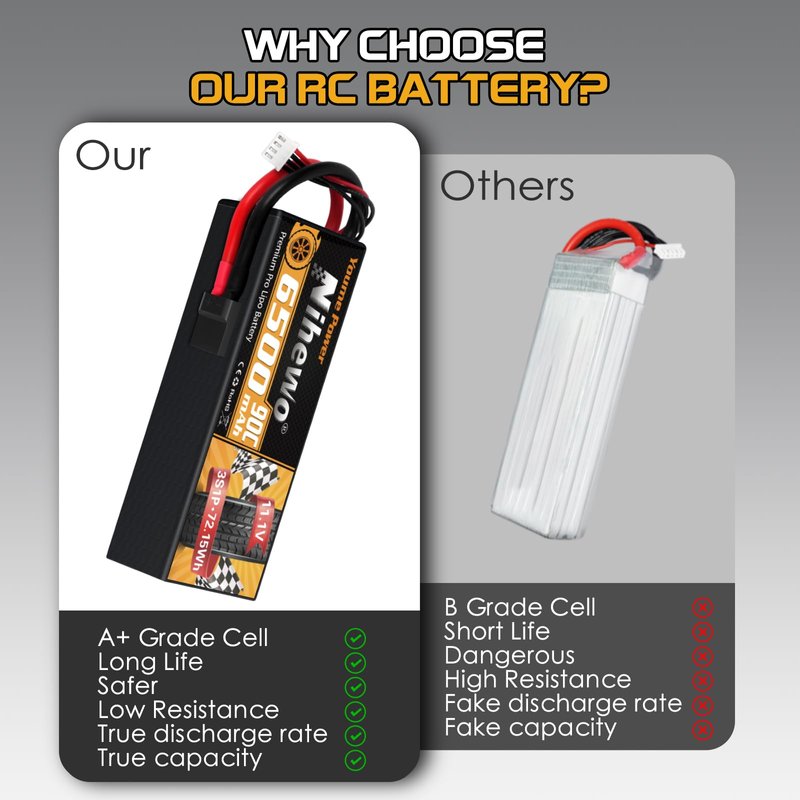 - 🔋3S Lipo Safety Note - Nihewo 3s rc battery Built-in protection mechanism ensures safe charging and use. Don't overcharge more than 4.2V and don't over discharge below 3.2V. Using a genuine brand balance charger, never leave the battery unattended when charging.