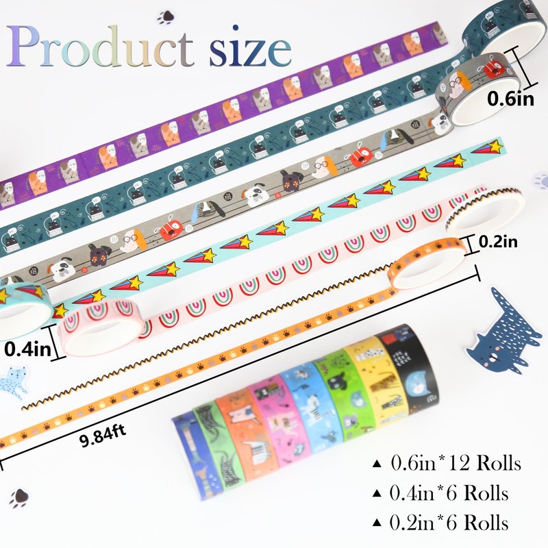 - 【Multiple sizes】24 rolls of Kawaii washy tape with a cute and innovative washi tape set. This decorative tape has 3 different widths sizes, making your creations richer and more varied. Including 0.59 inches (15mm) x 12 rolls in width,0.39 inches (10mm) x 6 rolls in width, and 0.19 inches (5mm) x 6 rolls in width. Each roll of tape is 9.8 feet (3m) in length.