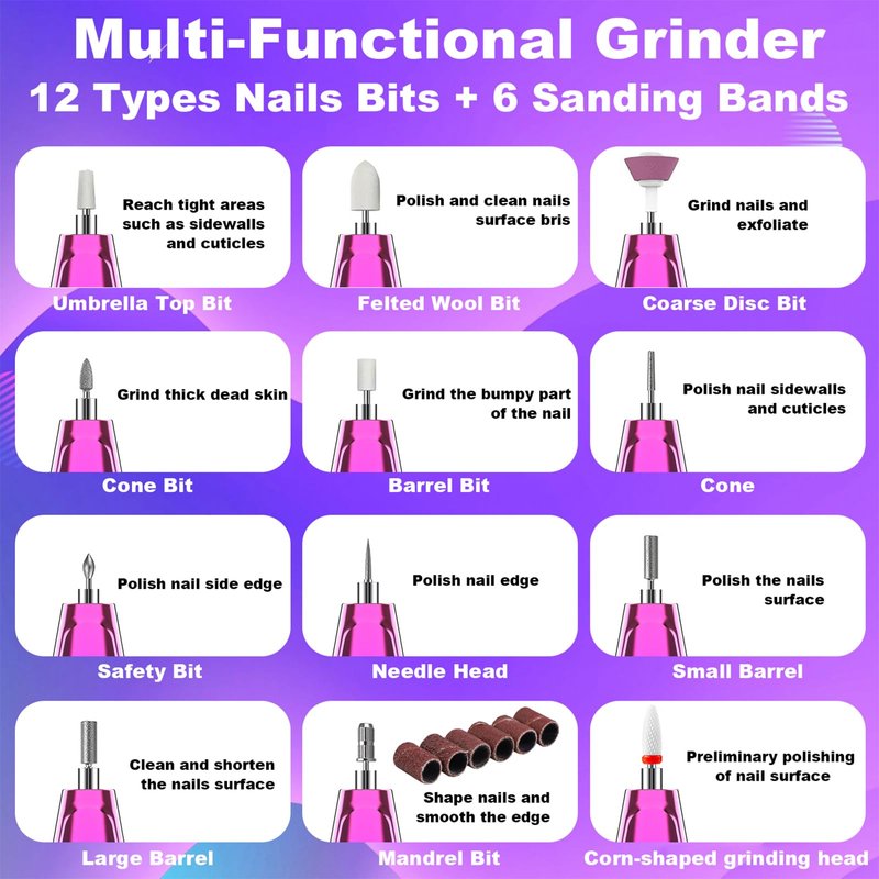 - 6).【Professional and Multi function】- Nail Drill Kit Designed with 12 optional standard bits, 6pcs sanding bands ,which are suitable for grinding, carving, shaping, polishing,filing for all nail arts and removing cuticle and even can be used for your pet.Our NIKOOCARE kit saves you time and help you make beautiful nails.