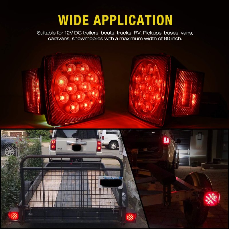 - multi-functions: combined functions of stop, turn tail light, side marker, license plate light. perfect for 12v dc vehicles with max width of 80 inches. fit most trailers, boats, trucks, rv, marine, pickups, camper, tractors, etc. bus, lorry, van, caravan, snowmobile utility trailers