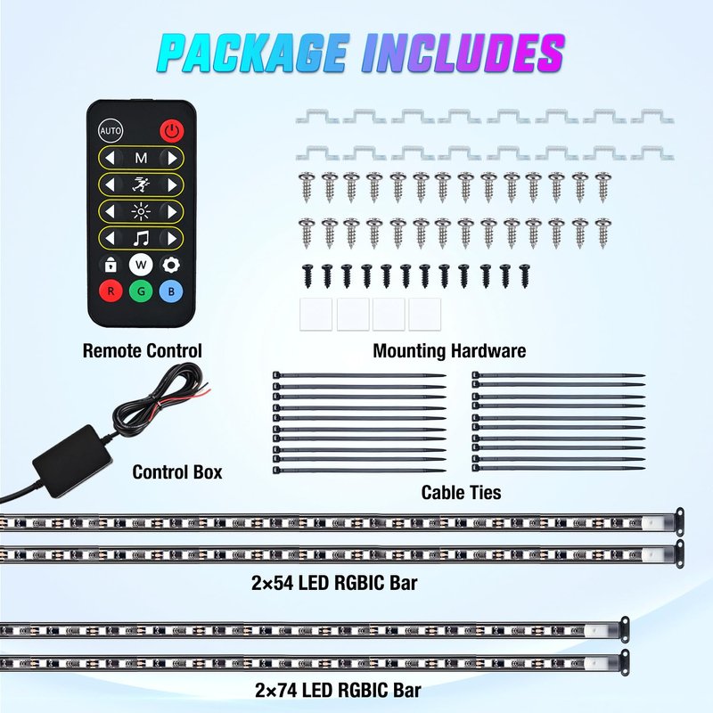 - Package Includes: 4PCS LED light strips, Remote Controller, Control Box, Mounting Hardware(screws, clips and zip ties), Double Sided Tape, Instruction Manual