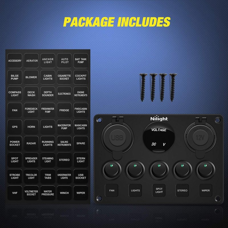 - Multi-function switch panel: product integrated with dual USB charger, digital voltmeter, 12v outlet, waterproof panel and 5 on/off rocker switches, this 12v/24vdc switch panel can meet your various needs