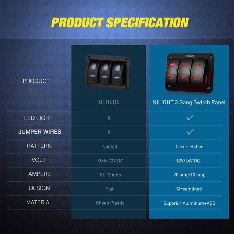 - Package includes: a pre-wired rocker switch and mounting screws. 2 Year Warranty by Nilight.