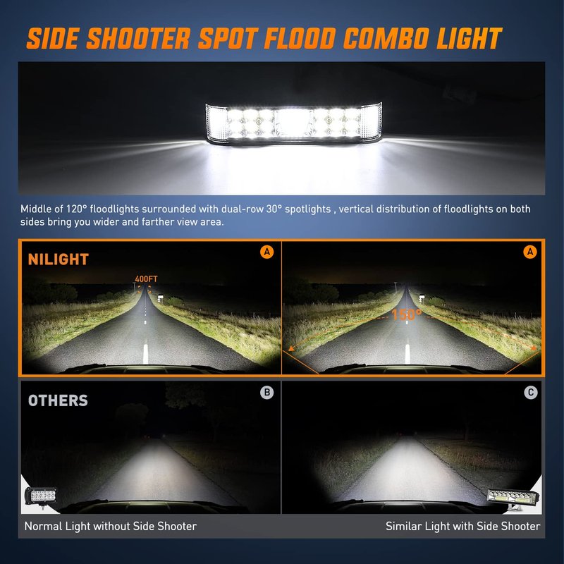- Side Shooter Design: Designed with side lights at two ends to work with the spot at the front. Perfectly combines spot and flood light beam, shoots out a 150° wider and further light coverage to clear darkness and potential hazard, increasing your driving safety. Works great as fog lights, side lights, driving lights, auxiliary lights etc