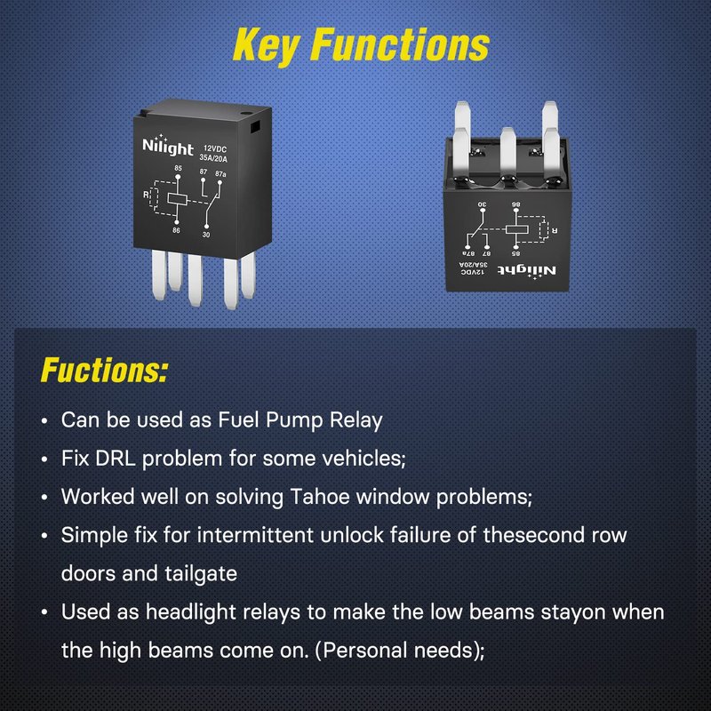 - Key Functions: Due to a damaged or worn out sensor, switch, or relay, such problems of Turn signal inoperative,hazard lights and headlights inoperative, cruise control inoperative, warning indicators on the instrument panel, service engine soon light illuminates and no start or hard start may occur, and Nilight multi-purpose relay can well fix the issues.