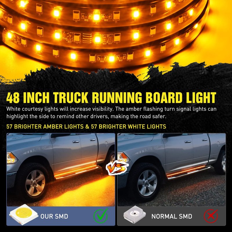 - Impressive brightness: The 48ch running board lights includes 114 PCS high intensity LED chips, amazing super bright lighting output,it is powered by 57 LEDs of white for door/step/DRL/parking lights and 57 LEDs of amber color for sequential turn signal lights. Brighter than other Truck LED running board lights in the market.