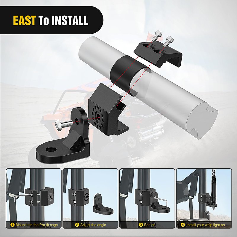 - 【Easy to Installation】 This UTV whip lights mount bracket is easy to install, all hardware included, directly bolt-on design, no drilling or trimming. And the mounting angle can be adjusted, you can loosen the bolt and change it to the perfect angle you want