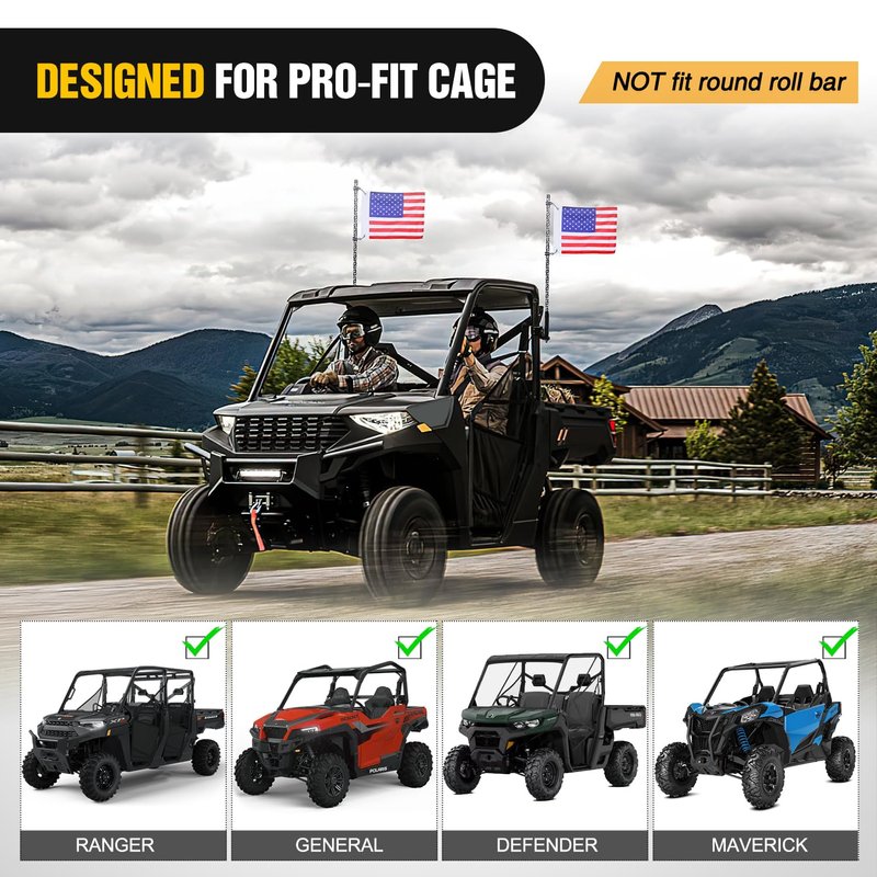 - 【For Pro-Fit Cage Only】The whip light mounting brackets will be compatible with Polaris Ranger General Can am Defender Maverick Trail/ Sport and Can am Commander 2021+, you can choose to install the UTV flag mount in a rear or front pro-fit cage