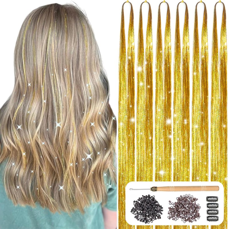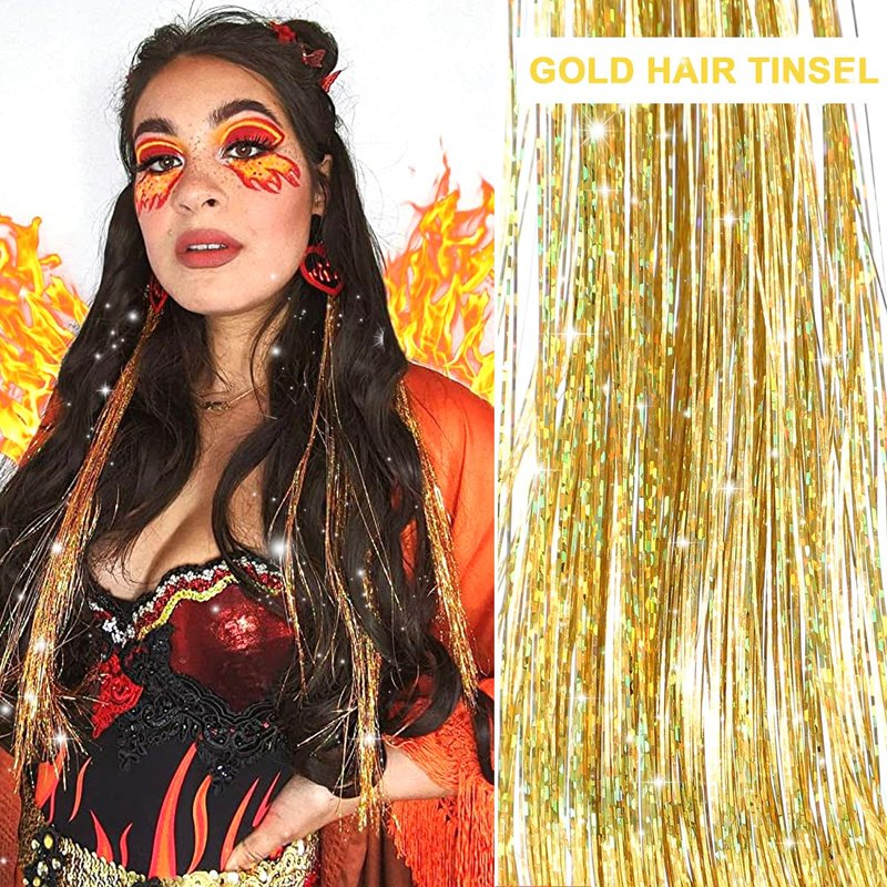 - 48 Inches Sparkling Gold Hair Tinsel - 1400 Strands 6 Pcs Gold Tinsel Hair Extensions are fold packaged separately, and 48 inches are long enough, so you can adjust to your preferred length.