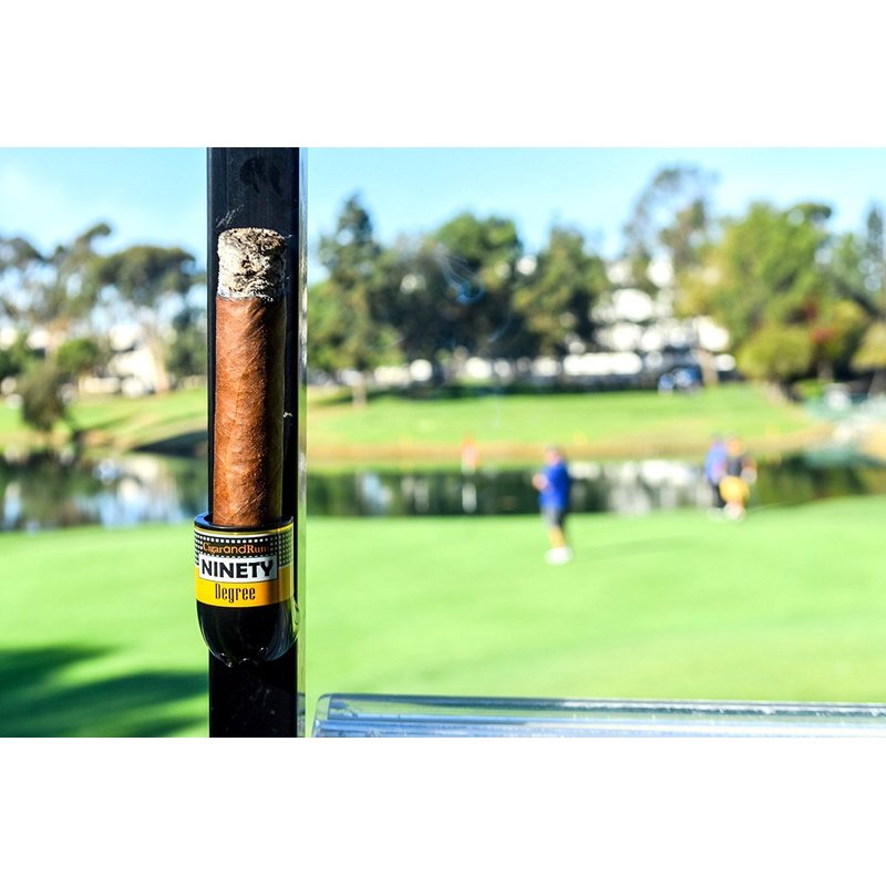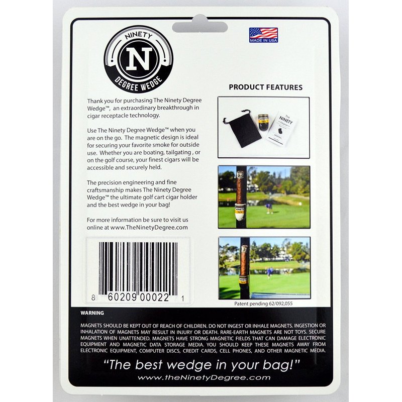 We take pride in developing, designing and manufacturing the NINETY DEGREE entirely in the U.S.A. There are many cigar holders available, the issue with most is that they pinch your premium cigars. Any cigar connoisseur knows that tobacco leaves are delicate ...so why would you clip or force your cigar in a gadget which will eventually puncture them. The NINETY DEGREE applies no pressure, ensuring that your cigar is in perfect condition to enjoy every time you reach for it. the NINETY DEGREE resolves typical cigar clip issues by allowing you to gently place your cigars in a secure holder which can handle a lancero to a gordo (60 ring gauge). The NINETY DEGREE won?t smash your cigar or allow it to fall from the holder. A sturdy and compact device, the magnetic design of the NINETY DEGREE is not limited to just a golf cart. You can use it on your deck, boat, while tailgating, or anywhere you may want your cigar held. All you need is a metal surface. It?s that simple! Thanks to the vertical design of the NINETY DEGREE, your cigar will always rest away from the mounted surface assisting in a consistent slow and even burn. That's why the NINETY DEGREE is the best thing that happened to cigars. The NINETY DEGREE will be your ?best wedge in your bag!? Thank you for purchasing The Ninety Degree Wedge", an extraordinary breakthrough in cigar receptacle technology. Durable and attractive design with assortment of colors. Peatures state of the art design and quality. The precision engineering and fine craftsmanship makes The Ninety Degree" the ultimate golf cart cigar holder.Use the Ninety Degree" when you are on the go; the magnetic design is ideal for securing you favorite smoke for outside use. Whether you are boating, tailgating, or on the golf course, your finest cigars will be accessible and securely held. With our commitment to maintain the highest quality and innovation, Cigar and Rum inc.