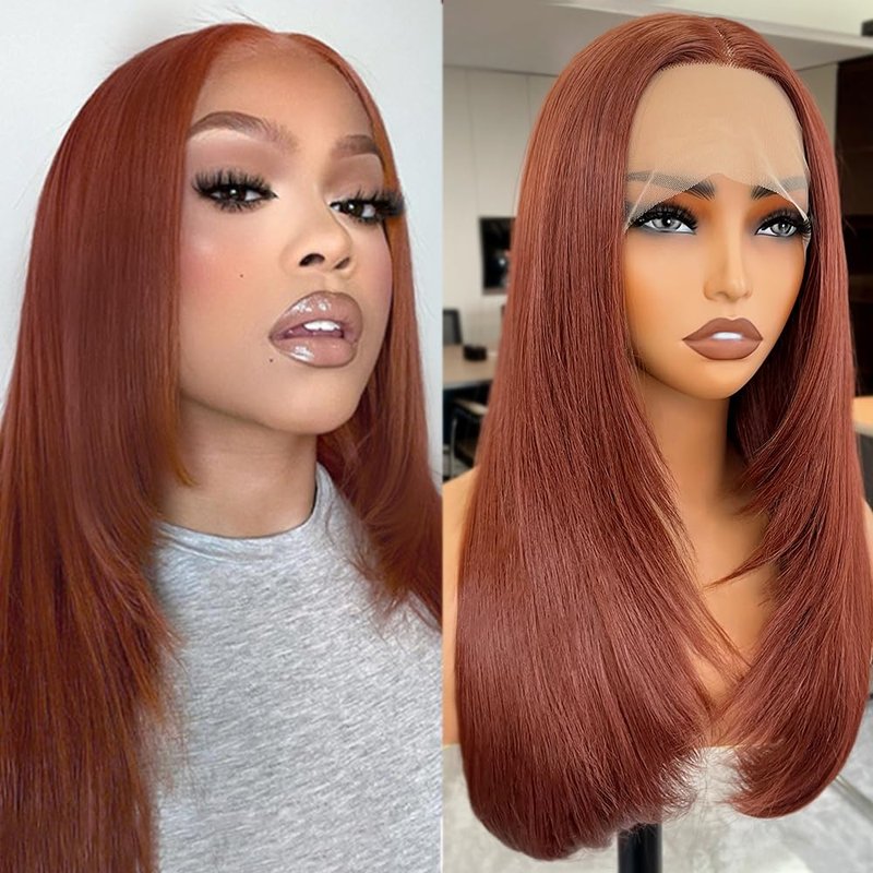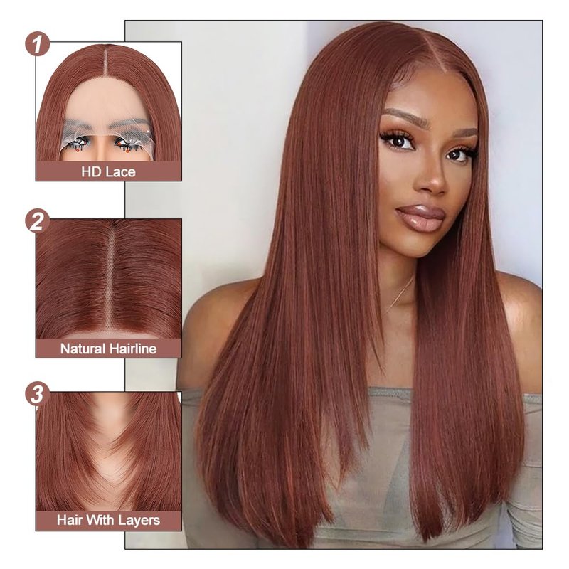 Ninroc Straight Lace Front Wigs Natural Black Layered Glueless Straight Hair Synthetic Lace Front Wig Pre Plucked Natural Hairline Heat Resistant Fiber Hair Lace Wigs For Women (Reddish Brown, 22inch)