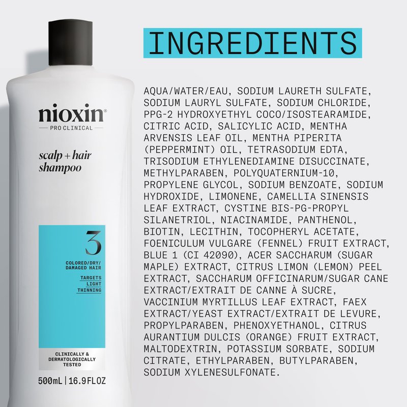 - PREPARE HAIR AND SCALP for a complete hair thickening treatment with Nioxin's three part System 3 Cleanser for Color Treated Hair with Light Thinning