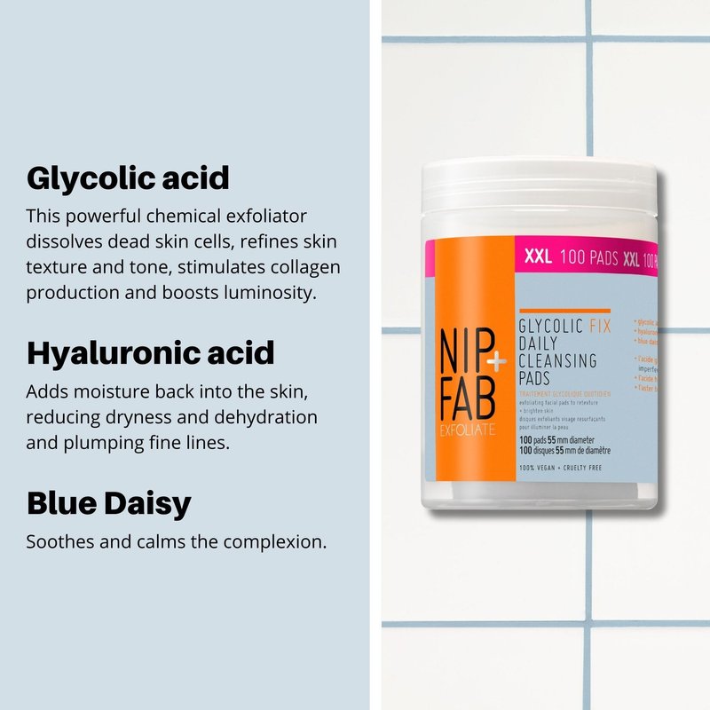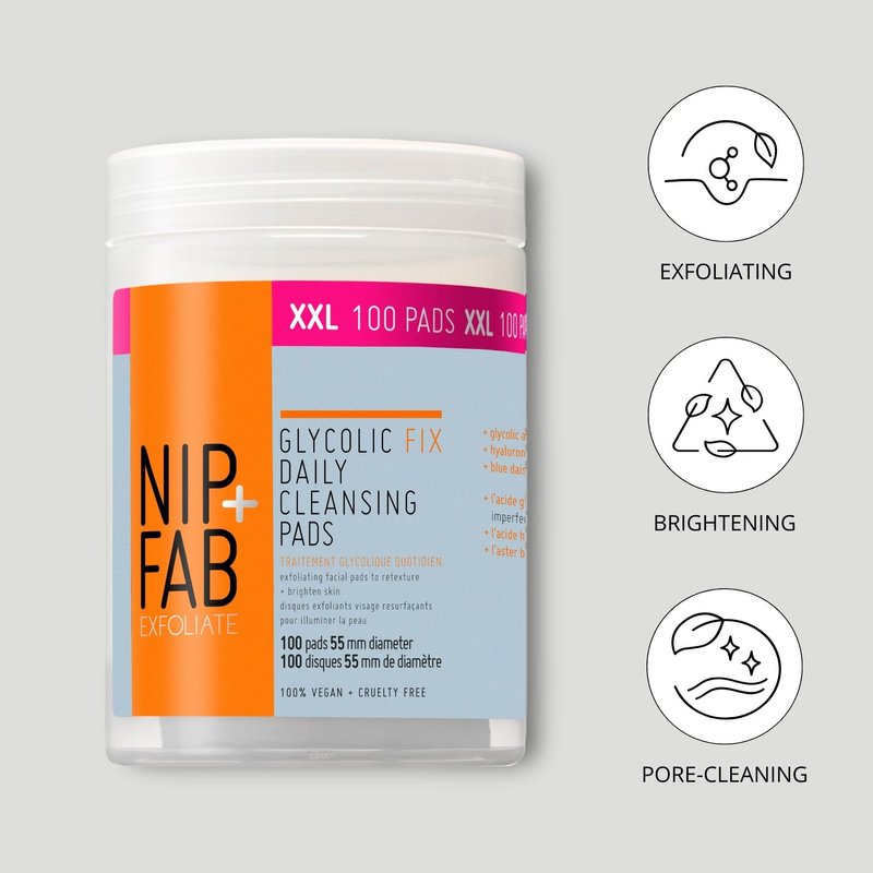 - GENTLY EXFOLIATES THE SKIN – Nip + Fab Glycolic Fix Daily Cleansing Face Pads work to gently exfoliate and retexture skin. Use these exfoliating glycolic acid cleanser pads for face to reveal brighter and smoother skin.