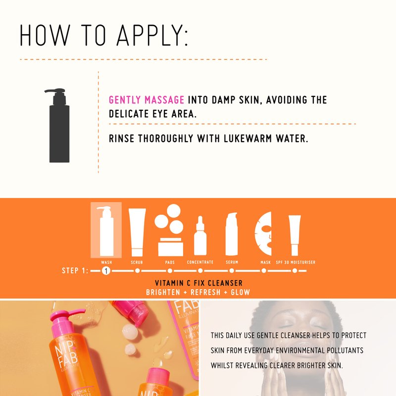 - CLEANSE AWAY TO A FRESH GLOW – Nip + Fab Vitamin C Fix Gel Cleanser cleanses skin to get rid of all the dirt and grime. This vitamin C cleanser for face gives the skin a refreshing, radiant boost.