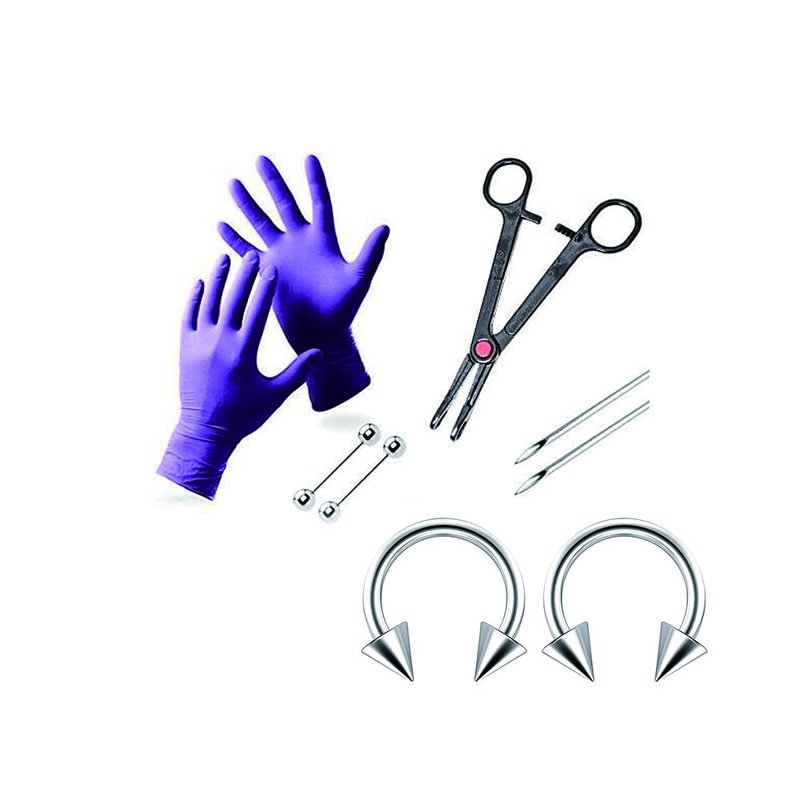 - 9PCS Piercing Kit includes: (2Pcs) 14G Straight Barbell; (2Pcs) 14G Horseshoe Barbell; (2Pcs) 14G Needles Are 100% Sterilized using ethylene oxide (EO) gas; (1Pc) Limited Edition Forceps Clamps, (2Pcs) Pair of Latex Gloves - Large; Everything you need to pierce!