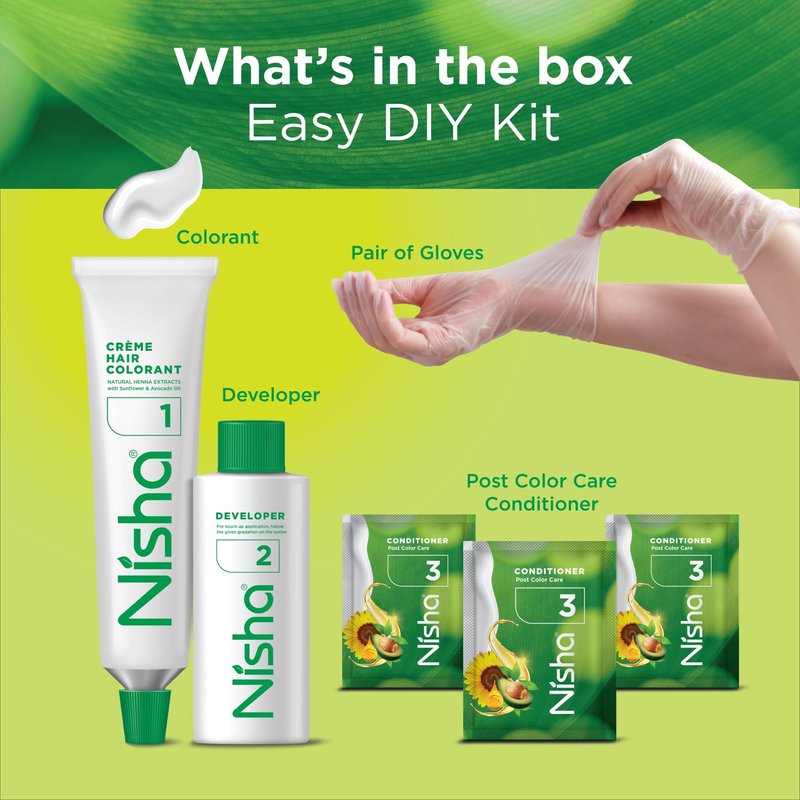 - Package includes- 1 Nisha 60ml Developer Bottle, 1 Nisha hair colorant 60gm Tube, 3 Conditioner 6ml/each, 1 pair hand gloves and 1 manual for home use.