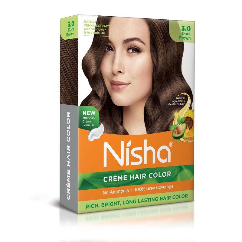 Nisha Crème Hair Color is a crème-based hair color with the benefits of Sunflower, Avocado and Henna extracts, these herbs constitute a perfect blend for hair color. Nisha crème hair color not only covers your grey hair but also makes your hair soft, silky and stylish. This rich, bright & long lasting color is available in 18 beautiful shades. All shades are Ammonia free except Fashion/Blonde Shades