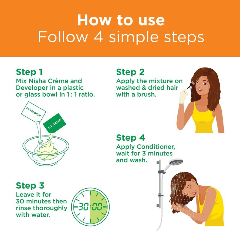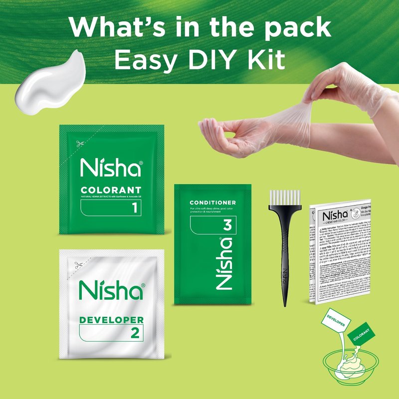 - Package includes- 1 Nisha 20ml developer, 1 Nisha 20gm hair colorant and 1 manual for self use.