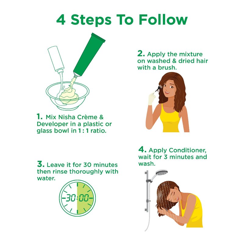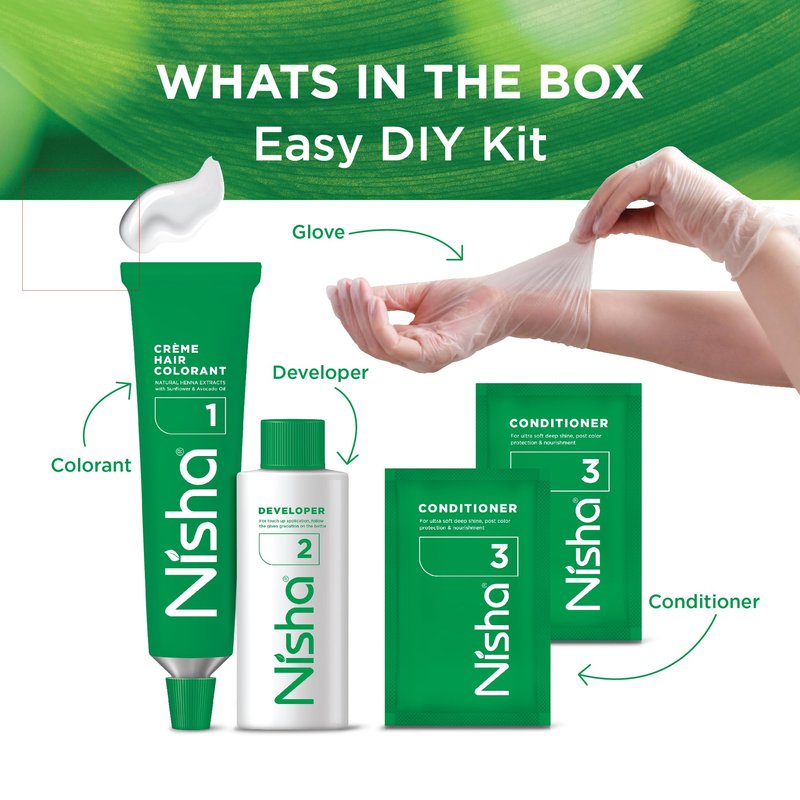- Package includes- 3 Nisha 60ml Developer Bottle, 3 Nisha hair colorant 60gm Tube, 3x3 Conditioner 6ml/each, 3 pair hand gloves and 3 manual for home use.