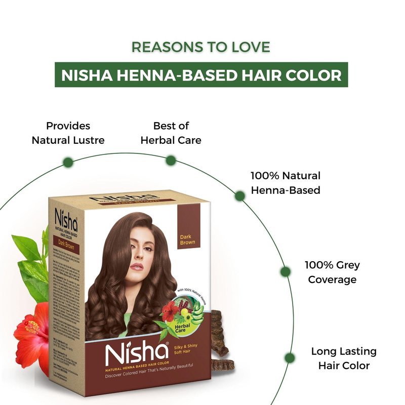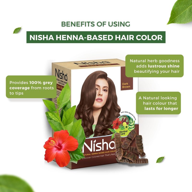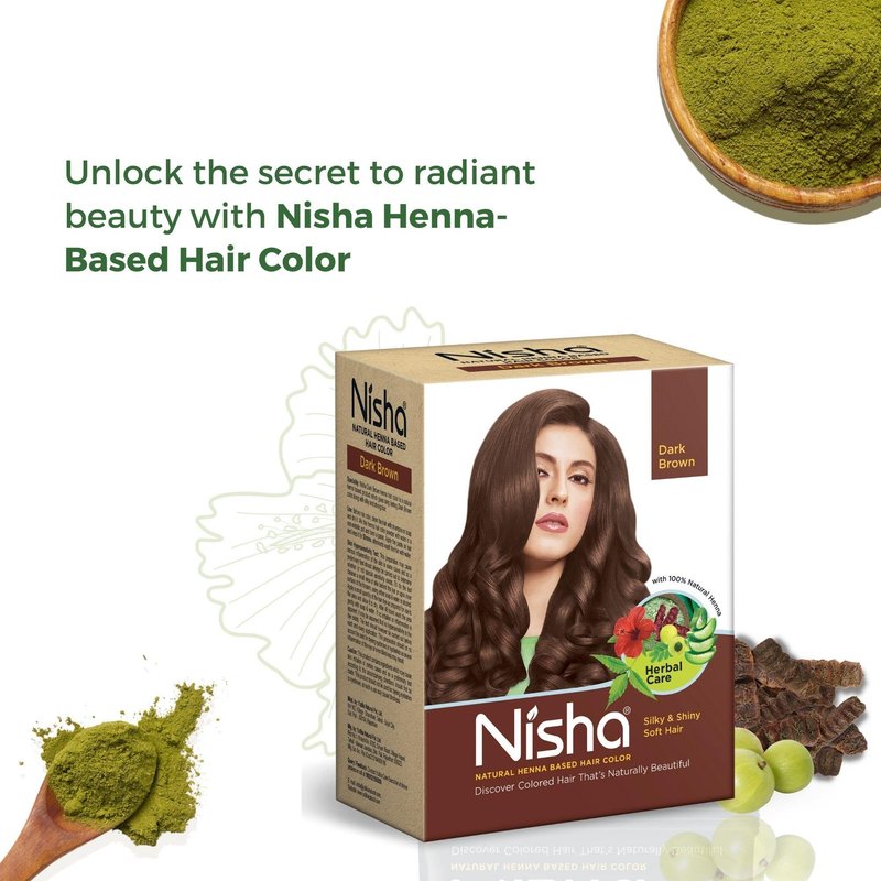 - PACKAGING INCLUDES: 1 Box of Nisha Unisex henna-based hair color, Dark Brown, 2.12 oz (6 sachets of 0.35 oz each Inside the box)