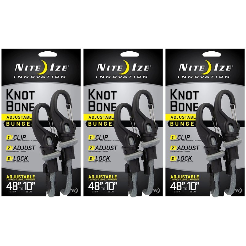 At Nite Ize, we find it almost impossible to look at simple everyday tools without thinking of ways we could improve them. It drives the people around us a little crazy sometimes (okay, all the time), but the result is a line of products that have one important thing in common - they're a smarter and easier-to-use version of everything else out there. Take our KnotBone Adjustable Bungee, for example. With carabiner clips instead of open hooks at each end, it not only attaches to your anchor points, it locks there. Instead of elastic that loses its stretch over time, the KnotBone Bungee has a durable, high quality cord that threads through each end, adjusts from 48" to 10" in the #9 size and from 28" to 6" in the #5 size. Once you have it adjusted to the right length, secure it in place with a simple wrap-and-lock motion. We've even added small self-clipping plastic caps to the cord ends to keep them in place once you've got your load secured. No more pulling, stretching, and re-hooking to get the tension you want - job after individual job, the KnotBone Bungee stays right where you attach it, pulls securely to the exact length you need, and locks there.